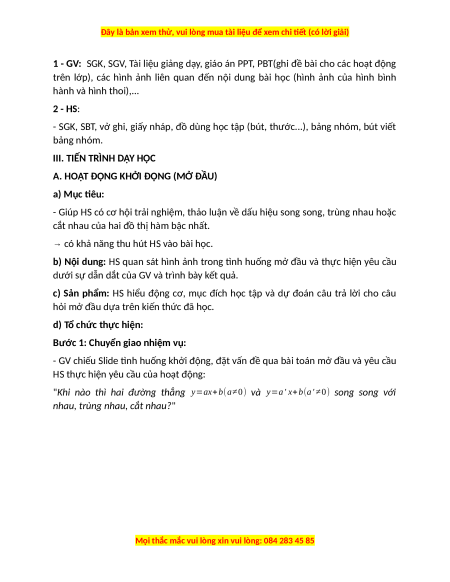 - Giúp HS có cơ hội trải nghiệm, thảo luận về dấu hiệu song song, trùng nhau hoặc