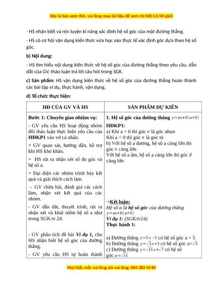- HS Am hiểu nội dung kiến thức về hệ số góc của đường thẳng theo yêu cầu, dẫn