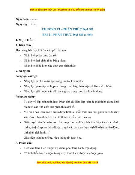 BÀI 21. PHÂN THỨC ĐẠI SỐ (1 tiết) I. MỤC TIÊU: