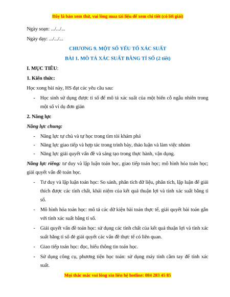 BÀI 1. MÔ TẢ XÁC SUẤT BẰNG TỈ SỐ (2 tiết) I. MỤC TIÊU: