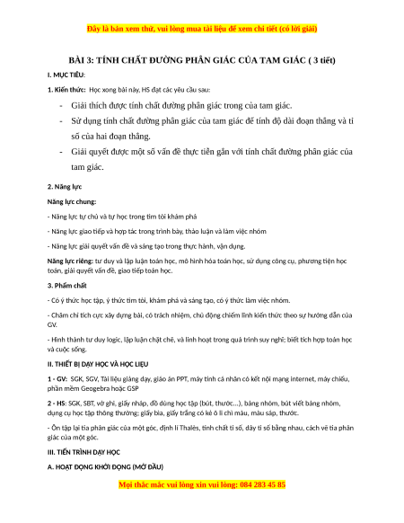 BÀI 3: TÍNH CHẤT ĐƯỜNG PHÂN GIÁC CỦA TAM GIÁC ( 3 tiết) I. MỤC TIÊU: