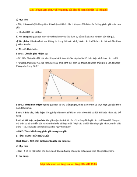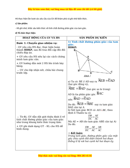 - Giúp HS có cơ hội khám phá tính chia tỉ lệ của đường phân giác thông qua hoạt động trải nghiệm. b) Nội dung: