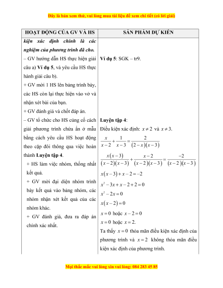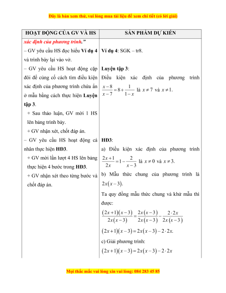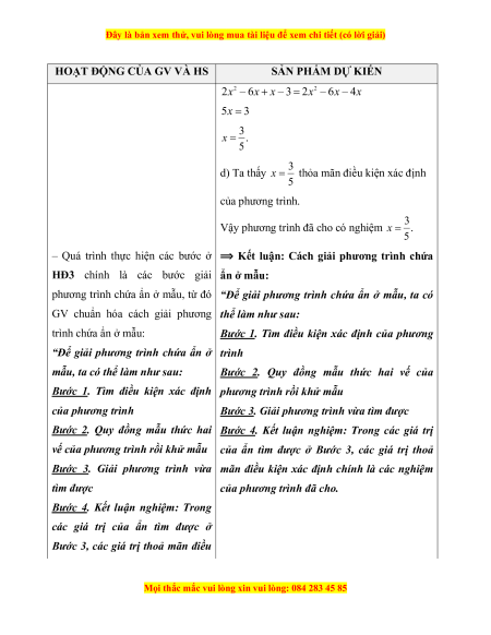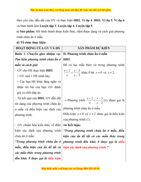 – Nhận biết được phương trình chứa ẩn ở mẫu và cách giải phương trình chứa ẩn ở mẫu.