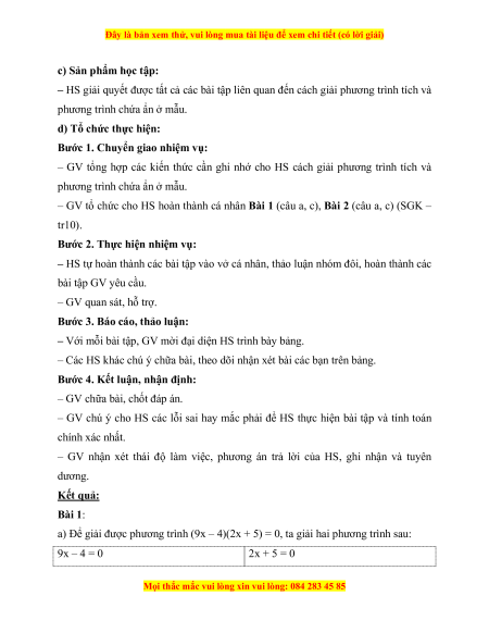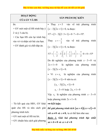 giải phương trình tích theo yêu cầu, dẫn dắt của GV và thực hiện HĐ1, đọc và thảo