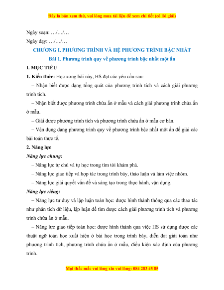 Bài 1. Phương trình quy về phương trình bậc nhất một ẩn I. MỤC TIÊU