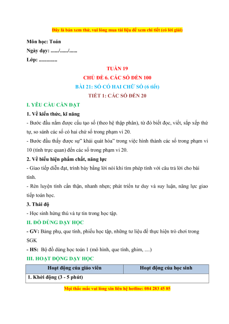 BÀI 21: SỐ CÓ HAI CHỮ SỐ (6 tiết) TIẾT 1: CÁC SỐ ĐẾN 20 I. YÊU CẦU CẦN ĐẠT