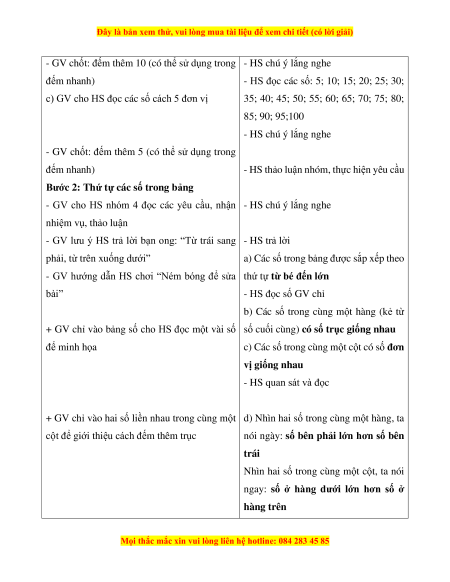 a) Mục tiêu: HS quan sát bảng các số từ 1 đến 100, nhận biết bảng gồm 10 hàng và 10 cột. b) Cách tiến hành: Bước 1: Đọc số