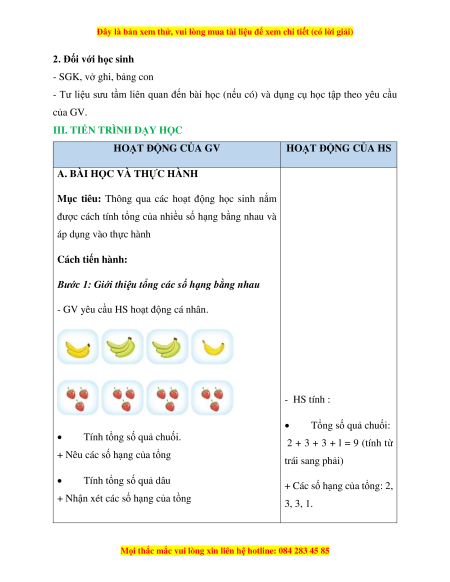 - GV yêu cầu HS hoạt động cá nhân. - HS tính : Tổng số quả chuối: