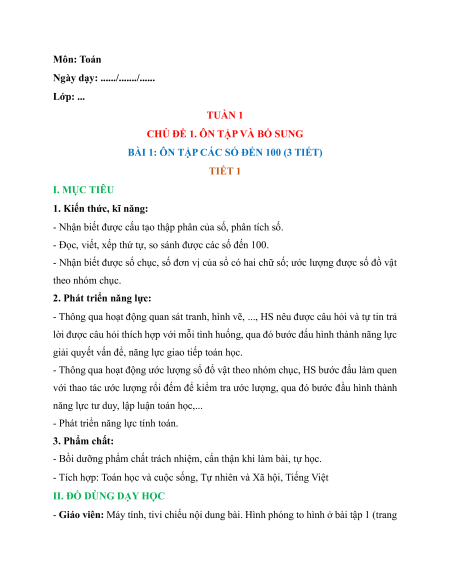 BÀI 1: ÔN TẬP CÁC SỐ ĐẾN 100 (3 TIẾT) TIẾT 1 I. MỤC TIÊU