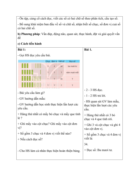 b) Phương pháp: Vấn đáp, động não, quan sát, thực hành, đặt và giải quyết vấn đề c) Cách tiến hành Bài 1: Bài 1.