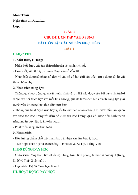 BÀI 1: ÔN TẬP CÁC SỐ ĐẾN 100 (3 TIẾT) TIẾT 1 I. MỤC TIÊU