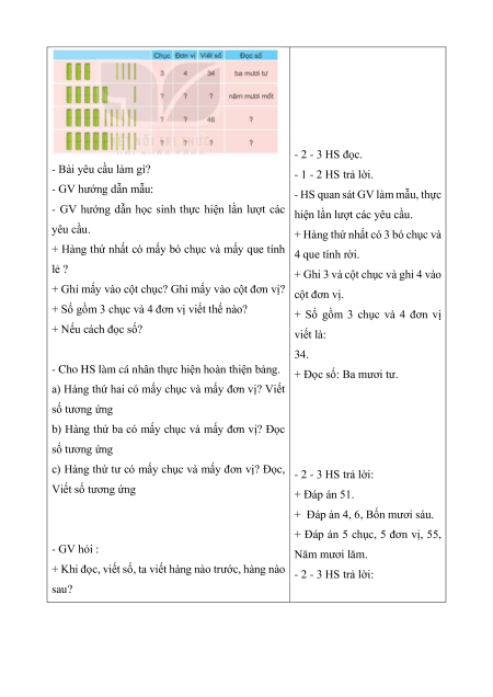 + Số gồm 3 chục và 4 đơn vị + Nếu cách đọc số? viết là: 34.