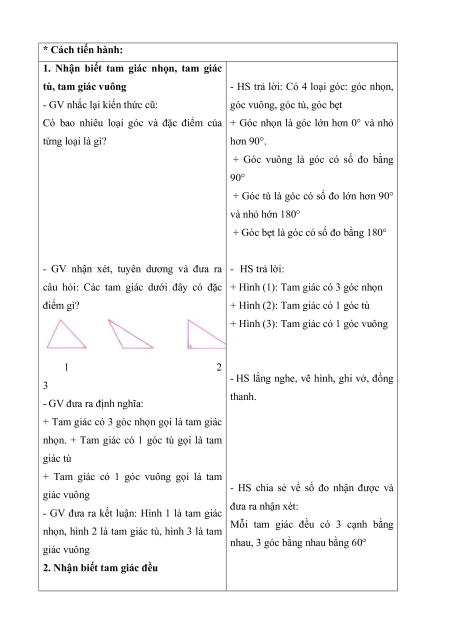nhọn, hình 2 là tam giác tù, hình 3 là tam Mỗi tam giác đều có 3 cạnh bằng giác vuông