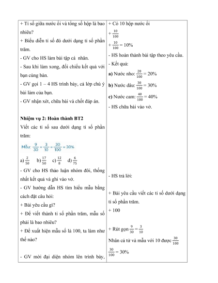 - HS thực hiện biểu diễn được tỉ số phần trăm.