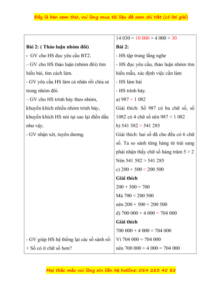 phải nhận thấy chữ số hàng trăm 5 > 2 Nên 541 582 > 541 285 c) 200 + 500 < 200 500 Giải thích 200 + 500 = 700 Mà 700 < 200 500 nên 200 + 500 < 200 500 d) 700 000 + 4 000 = 704 000 Giải thích 700 000 + 4 000 = 704 000