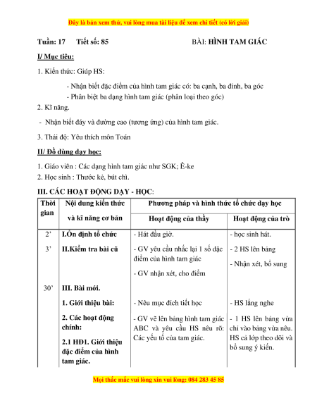 Giáo án Bài 85 Toán lớp 5: Hình tam giác