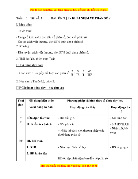 Tuần: 1 Tiết số: 1 BÀI: ÔN TẬP - KHÁI NIỆM VỀ PHÂN SỐ 1 I/ Mục tiêu: 1. Kiến thức: