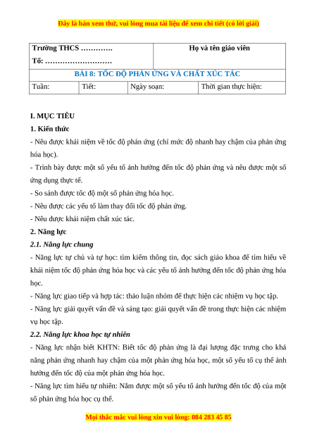 BÀI 8: TỐC ĐỘ PHẢN ỨNG VÀ CHẤT XÚC TÁC Tuần: Tiết: Ngày soạn: Thời gian thực hiện: I. MỤC TIÊU 1. Kiến thức