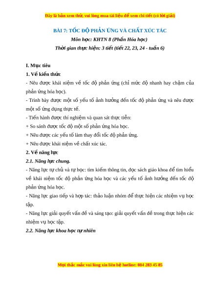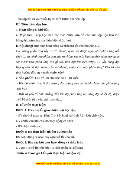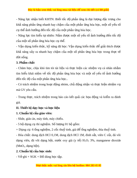 Đây là bản xem th , vu ử i lòng mua tài li u ệ đ xe ể m chi ti t (c ế ó l i ờ gi i ả ) - Năng l c ự nh n ậ bi t ế KHTN: Bi t ế t c ố độ ph n ả ng ứ là đ i ạ lư ng ợ đ c ặ tr ng ư cho khả năng ph n ả ng ứ nhanh hay ch m ậ c a ủ m t ộ ph n ả ng ứ hóa h c, ọ m t ộ s ố y u ế tố cụ th ể nh h ả ư ng ở đ n t ế ốc đ c ộ a m ủ t ộ ph n ả ng hóa h ứ c. ọ - Năng l c ự tìm hi u ể tự nhiên: N m ắ đư c ợ m t ộ số y u ế t ố nh ả hư ng ở đ n ế t c ố độ c a ủ m t ộ số ph n ả ng hóa h ứ c c ọ ụ th . ể - V n ậ d ng ụ ki n ế th c, ứ kỹ năng đã h c: ọ V n ậ d ng ụ ki n ế th c ứ đ ể gi i ả thích đư c ợ khả năng x y ả ra nhanh hay ch m ậ c a ủ m t ộ số ph n ả ng ứ hóa h c ọ trong th c ự tế đ i ờ sống. 3. Phẩm ch t ấ - Chăm h c, ọ ch u ị khó tìm tòi tài li u ệ và th c ự hi n ệ các nhi m ệ vụ cá nhân nh m ằ tìm hi u ể khái ni m ệ về t c ố độ ph n ả ng ứ hóa h c ọ và m t ộ số y u ế tố nh ả hư ng ở đ n t ế ốc đ c ộ a ủ m t ộ ph n ả ng hóa h ứ c.. ọ - Có trách nhi m ệ trong ho t ạ đ ng ộ nhóm, ch ủ đ ng ộ nh n ậ và th c ự hi n ệ nhi m ệ vụ mà GV yêu cầu. - Trung th c, ự trách nhi m ệ trong báo cáo k t ế quả các h a ọ đ ng ộ và ki m ể ra đánh giá. II. Thi t ế b d ị y h ạ c ọ và h c l ọ i u ệ 1. Chuẩn b c ị a g ủ iáo viên: