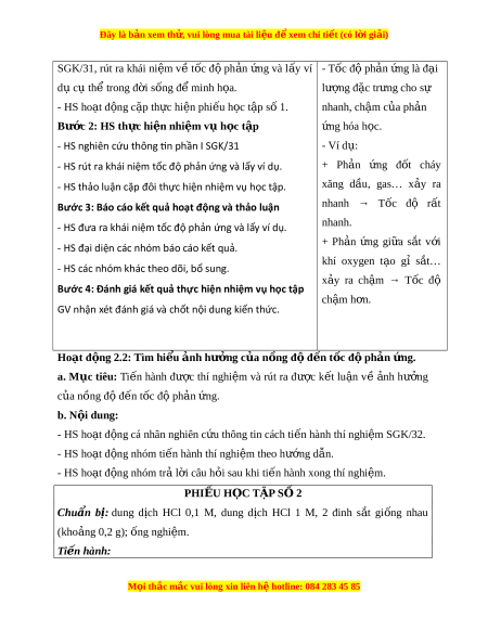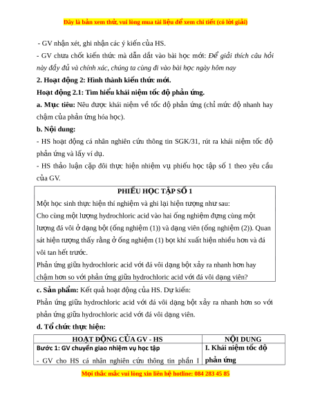 ứ thông tin SGK/31, rút ra khái ni m ệ t c ố độ ph n ả ng và l ứ ấy ví d . ụ - HS th o ả lu n ậ c p ặ đôi th c ự hi n ệ nhi m ệ vụ phi u ế h c ọ t p ậ số 1 theo yêu c u ầ c a ủ GV. PHI U Ế H C Ọ TẬP S 1 Ố M t ộ h c s ọ inh th c hi ự n t ệ hí nghi m ệ và ghi l i ạ hi n t ệ ư ng ợ nh s ư au: Cho cùng m t ộ lư ng hydr ợ ochloric acid vào hai ng nghi ố m ệ đ ng ự cùng m t ộ lư ng ợ đá vôi d ở ng b ạ t ộ ( ng nghi ố m ệ (1)) và d ng ạ viên ( ng nghi ố m ệ (2)). Quan sát hiện tư ng t ợ h y r ấ ng ằ ở ống nghi m ệ (1) b t ọ khí xu t ấ hi n nhi ệ u h ề n và đá ơ vôi tan h t ế trư c. ớ Ph n ả ng gi ứ a hydr ữ ochloric acid v i ớ đá vôi d ng b ạ t ộ x y r ả a nhanh h n hay ơ ch m ậ h n s ơ o v i ớ ph n ả ng gi ứ a ữ hydrochloric acid v i ớ đá vôi d ng vi ạ ên? c. Sản phẩm: K t ế quả ho t ạ đ ng ộ c a H ủ S. D ki ự n: ế Ph n ả ng ứ gi a ữ hydrochloric acid v i ớ đá vôi d ng ạ b t ộ x y ả ra nhanh h n ơ so v i ớ ph n ả ng gi ứ a hydr ữ ochloric acid v i ớ đá vôi d ng ạ viên. d. T ch ổ ức thực hi n: ệ HOẠT Đ N Ộ G C A Ủ GV - HS N I Ộ DUNG