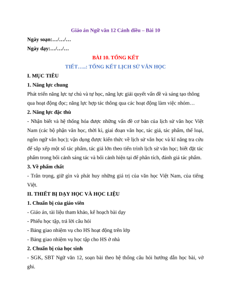 TIẾT…..: TỔNG KẾT LỊCH SỬ VĂN HỌC I. MỤC TIÊU 1. Năng lực chung