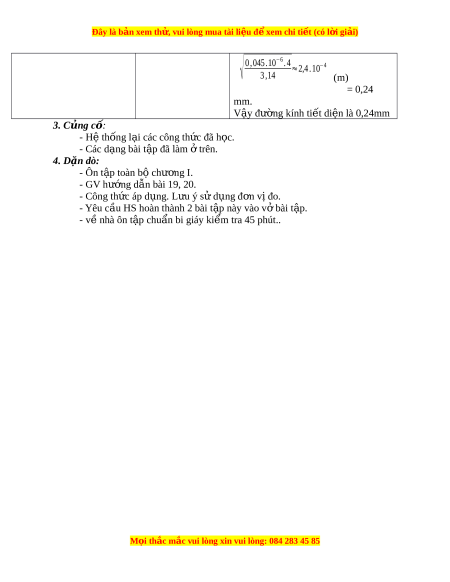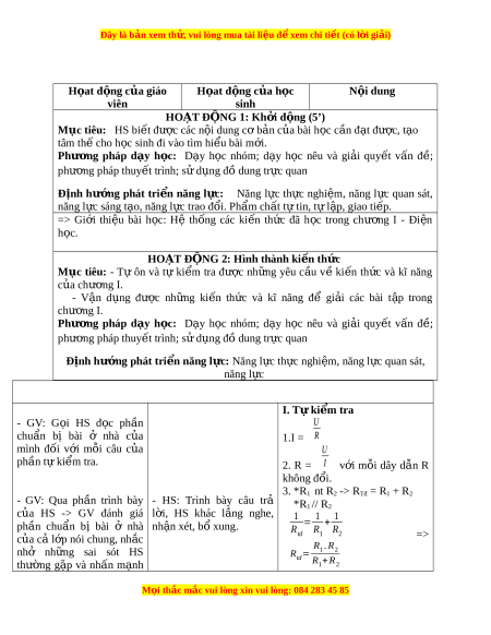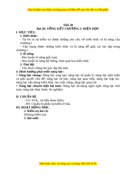 Đây là bản xem th , vu ử i lòng mua tài li u ệ đ xe ể m chi ti t (c ế ó l i ờ gi i ả ) Ti t ế 20 Bài 20: T N Ổ G K T Ế CHƯ N Ơ G I: ĐI N Ệ H C Ọ I. M C Ụ TIÊU. 1. Ki n ế th c: ứ - Tự ôn và tự ki m ể tra đư c ợ nh ng ữ yêu c u ầ về ki n ế th c ứ và kĩ năng c a ủ chư ng ơ I. - V n ậ d ng ụ đư c ợ nh ng ữ ki n ế th c ứ và kĩ năng để gi i ả các bài t p ậ trong chư ng ơ I. 2. Kĩ năng: - Rèn luy n kĩ ệ năng gi i ả toán. - Rèn luy n kĩ ệ năng h t