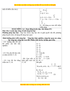 lực sáng tạo, năng l c t ự rao đ i ổ . Ph m ẩ chất t t ự in, t l ự p, gi ậ ao ti p. ế - GV: hư ng ớ d n ẫ HS trả l i ờ ph n ầ câu h i ỏ tr c ắ 12 - C nghiệm. 13 - B 14 - D 15 - A 16 - D - GV: Yêu c u ầ HS làm vi c ệ 17 - Tóm t t ắ cá nhân trả l i ờ 17, 18. U = 12V R1 nt R2 I = 0,3A - HS: Làm vi c ệ cá R1 // R2 I’ = 1,6A - GV: G i ọ HS lên b ng ả nhân gi i ả toán câu R1 ; R2 = ? ch a ữ câu 17, 18. 17, 18. Bài gi i ả U 12 *R I 0,3 1 nt R2 có R1 + R2 = = = 40( ) (1) R1 // R2 có R . R 1 2 U 12 = = =7,5 () R I ' 1,6 1+ R2 (2) T ( ừ 1) và (2) ta có: R1 + R2 = 40 M i ọ thắc m c