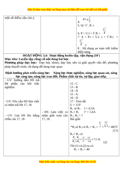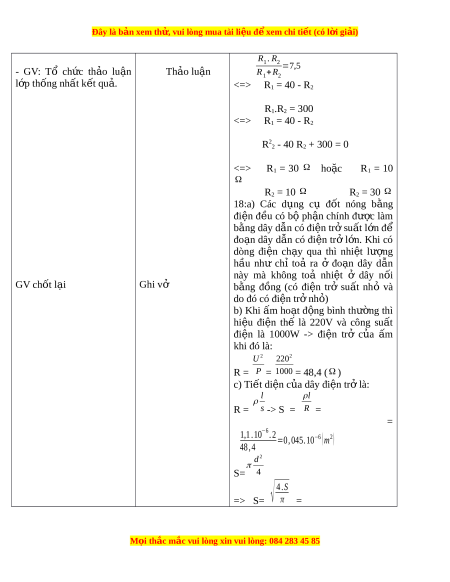 Đây là bản xem th , vu ử i lòng mua tài li u ệ đ xe ể m chi ti t (c ế ó l i ờ gi i ả ) R . R 1 2 - GV: Tổ ch c ứ th o ả lu n ậ Th o ả lu n ậ =7,5 R1+R2 l p t ớ hống nhất k t ế qu . ả <=> R1 = 40 - R2 R1.R2 = 300 <=> R1 = 40 - R2 R22 - 40 R2 + 300 = 0 <=> R1 = 30 ho c ặ R1 = 10 R2 = 10 R2 = 30 18:a) Các d ng ụ cụ đ t ố nóng b ng ằ điện đ u ề có bộ ph n ậ chính đư c ợ làm b ng ằ dây d n ẫ có đi n ệ tr ở su t ấ l n đ ớ ể đo n ạ dây d n ẫ có đi n ệ tr ở l n. ớ Khi có dòng đi n ệ ch y ạ qua thì nhi t ệ lư ng ợ