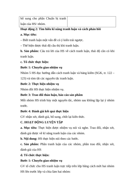 Hoạt động 2: Tìm hiểu kĩ năng tranh luận và cách phản hồi a. Mục tiêu: