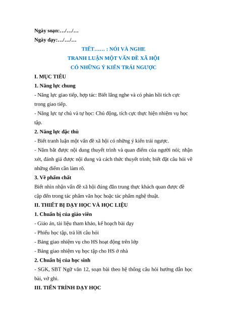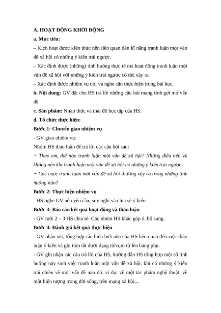 Giáo án Tranh luận một vấn đề xã hội có những ý kiến trái ngược nhau Ngữ Văn 12 Chân trời sáng tạo