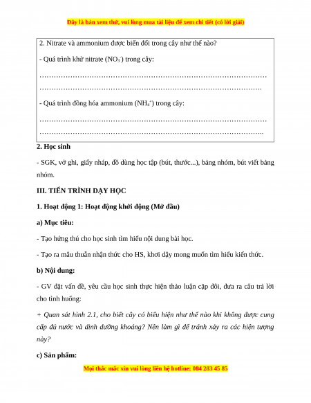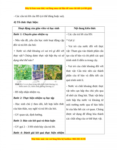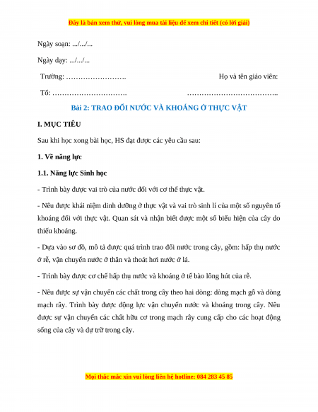Giáo án Trao đổi nước và khoáng ở thực vật Sinh học 11 Cánh diều
