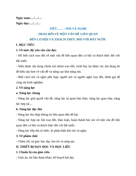- HS biết cách trao đổi về một vấn đề liên quan đến cơ hội và thách thức đối với đất nước.