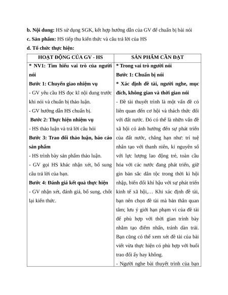 b. Nội dung: HS sử dụng SGK, kết hợp hướng dẫn của GV để chuẩn bị bài nói