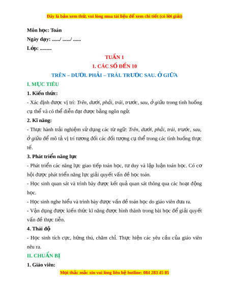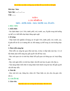 ợ v ịtrí: Trên, dư i ớ , ph i ả , trái, trư c, ớ sau, ở gi a ữ trong tình hu ng ố cụ th và có t ể h di ể n đ ễ t ạ đư c b ợ ng ằ ngôn ng . ữ 2. Kĩ năng: - Th c ự hành tr i ả nghi m ệ sử d ng ụ các từ ng : ữ Trên, dư i ớ , ph i ả , trái, trư c, ớ sau, ở gi a ữ để mô t ả vị trí tư ng ơ đ i ố các đ i ố tư ng ợ c ụ th ể trong các tình hu ng ố th c ự t . ế 3. Phát tri n nă ể ng l c ự - Phát tri n ể các năng l c ự giao ti p ế toán h c, ọ t ư duy và l p ậ lu n ậ toán h c. ọ Có cơ h i