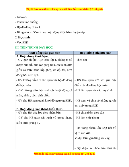 Đây là bản xem th , vu ử i lòng mua tài li u ệ đ xe ể m chi ti t (c ế ó l i ờ gi i ả ) - Giáo án. - Tranh tình huống. - Bộ đồ dùng Toán 1. - B ng ả nhóm: Dùng trong ho t ạ đ ng t ộ h c hành l ự uy n t ệ p. ậ 2. H c ọ sinh: - V , ở SGK III. TI N Ế TRÌNH D Y Ạ H C Ọ Hoạt đ ng c ộ a gi ủ áo viên Hoạt đ ng c ộ a h ủ c s ọ inh A. Hoạt đ ng k ộ h i ở đ ng. ộ - GV gi i ớ thi u: ệ H c ọ toán l p