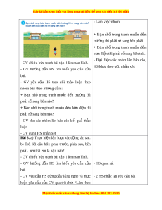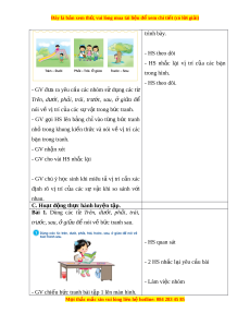 Đây là bản xem th , vu ử i lòng mua tài li u ệ đ xe ể m chi ti t (c ế ó l i ờ gi i ả ) trình bày. - HS theo dõi - HS nh c ắ l i ạ vị trí c a ủ các b n ạ trong hình. - HS theo dõi. - GV đ a r ư a yêu c u ầ các nhóm s d ử ng ụ các từ Trên, dư i ớ , ph i ả , trái, trư c, ớ sau, ở gi a ữ để nói v v ề ị trí c a các ủ s v ự t ậ trong b c t ứ ranh. - GV g i ọ HS lên b ng ả chỉ vào t ng ừ b c ứ tranh nhỏ trong khung ki n ế th c ứ và nói v ề v ịtrí các b n ạ trong tranh. - GV nh n xét ậ - GV cho vài HS nh c l ắ i ạ - GV chú ý h c ọ sinh khi miêu t ả v ịtrí c n ầ xác định rõ vị trí c a ủ các sự v t ậ khi so sánh v i ớ nhau. C. Hoạt đ ng t ộ h c hành l ự uy n t ệ p. ậ