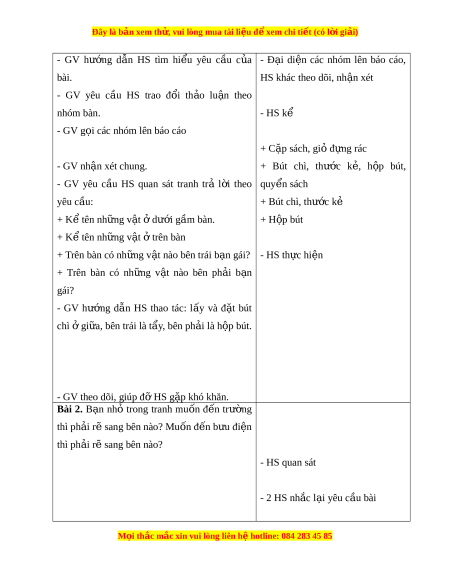 Đây là bản xem th , vu ử i lòng mua tài li u ệ đ xe ể m chi ti t (c ế ó l i ờ gi i ả ) - GV hư ng ớ d n ẫ HS tìm hi u ể yêu c u ầ c a ủ - Đ i ạ di n ệ các nhóm lên báo cáo, bài. HS khác theo dõi, nh n ậ xét - GV yêu c u ầ HS trao đ i ổ th o ả lu n ậ theo nhóm bàn. - HS kể - GV g i ọ các nhóm lên báo cáo + C p ặ sách, giỏ đ ng r ự ác - GV nh n xét ậ chung. + Bút chì, thư c ớ k , ẻ h p ộ bút, - GV yêu c u