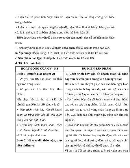 - Nhận biết và phân tích được luận đề, luận điểm, lí lẽ và bằng chứng tiêu biểu trong văn bản.