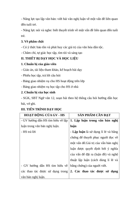 - Năng lực nói và nghe: biết thuyết trình về một vấn đề liên quan đến tuổi trẻ. 3. Về phẩm chất