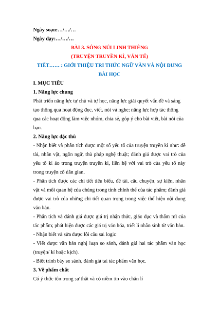 TIẾT…… : GIỚI THIỆU TRI THỨC NGỮ VĂN VÀ NỘI DUNG BÀI HỌC I. MỤC TIÊU 1. Năng lực chung