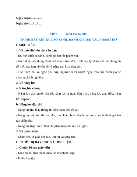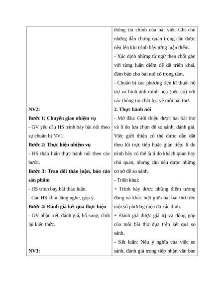 - Năng lực hợp tác khi trao đổi, thảo luận, hoàn thành bài nói so sánh, đánh giá hai tác phẩm thơ.