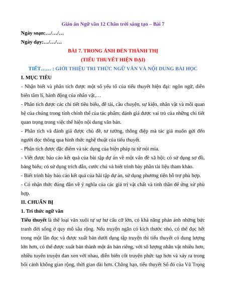 Giáo án Trong ánh đèn thành thị (Tiểu thuyết hiện đại) 2024 Chân trời sáng tạo