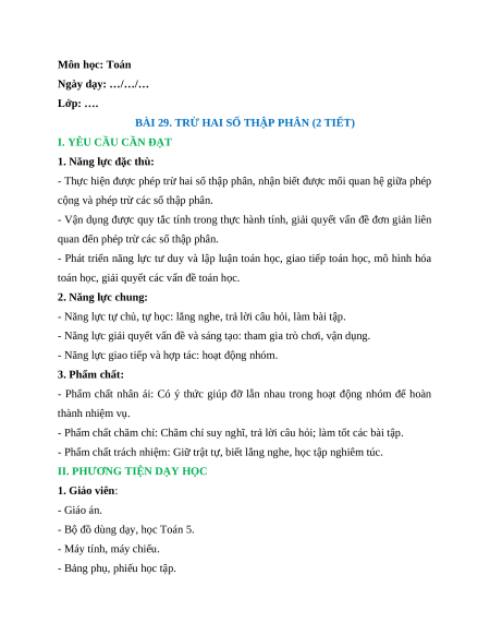 BÀI 29. TRỪ HAI SỐ THẬP PHÂN (2 TIẾT)
