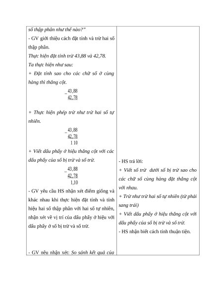 của phép tính 43,88 – 42,78, ta làm như thế nào?”