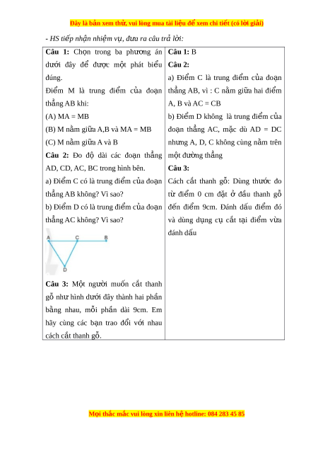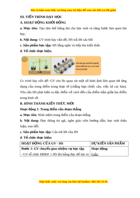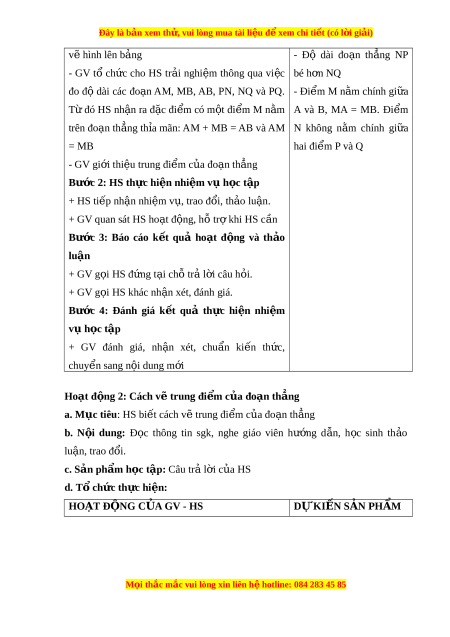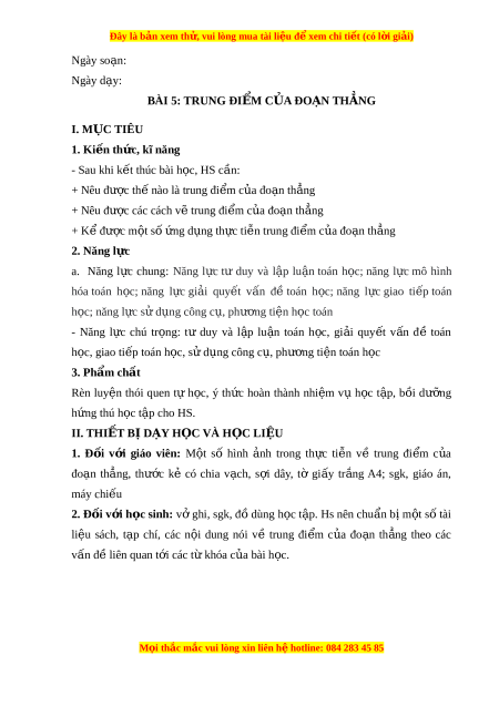 Đây là bản xem th , vu ử i lòng mua tài li u ệ đ xe ể m chi ti t ế (có l i ờ gi i ả ) Ngày so n: ạ Ngày d y: ạ BÀI 5: TRUNG ĐI M C Ể A Ủ ĐO N Ạ TH N Ẳ G I. M C Ụ TIÊU 1. Ki n t ế h c, kĩ ứ năng - Sau khi k t ế thúc bài h c, H ọ S c n: ầ + Nêu đư c ợ thế nào là trung đi m ể c a ủ đo n t ạ h ng ẳ + Nêu đư c ợ các cách v t ẽ rung đi m ể c a đo ủ n ạ th ng ẳ + K đ ể ư c ợ m t ộ số ng d ứ ng t ụ h c t ự i n t ễ rung đi m ể c a đo ủ n ạ th ng ẳ 2. Năng l c ự a. Năng l c ự chung: Năng l c ự tư duy và l p ậ lu n ậ toán h c; ọ năng l c ự mô hình hóa toán h c; ọ năng l c ự gi i ả quy t ế v n ấ đề toán h c; ọ năng l c ự giao ti p ế toán h c; ọ năng l c ự s d ử ng ụ công c , ph ụ ư ng ơ ti n ệ h c ọ toán - Năng l c ự chú tr ng: ọ tư duy và l p ậ lu n ậ toán h c, ọ gi i ả quy t ế v n ấ đề toán h c, gi ọ ao ti p t ế oán h c, ọ s d ử ng ụ công c , ph ụ ư ng ơ ti n t ệ oán h c ọ 3. Ph m ẩ chất Rèn luy n ệ thói quen tự h c, ọ ý th c ứ hoàn thành nhi m ệ vụ h c ọ t p, ậ b i ồ dư ng ỡ h ng t ứ hú h c t ọ p ậ cho HS.