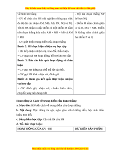 ỉ mãn: AM + MB = AB và AM N không n m ằ chính gi a ữ = MB hai đi m ể P và Q - GV gi i ớ thi u t ệ rung đi m ể c a ủ đo n t ạ h ng ẳ Bư c ớ 2: HS th c hi ự n nhi ệ m ệ v h ụ c t ọ p ậ + HS ti p ế nh n nhi ậ m ệ v , t ụ rao đ i ổ , th o ả lu n. ậ + GV quan sát HS ho t ạ đ ng, ộ h t ỗ r khi ợ HS c n ầ Bư c ớ 3: Báo cáo k t ế quả ho t ạ đ ng ộ và th o ả luận + GV g i ọ HS đ ng ứ t i ạ ch t ỗ r l ả i ờ câu h i ỏ . + GV g i ọ HS khác nh n xét ậ , đánh giá. Bư c ớ 4: Đánh giá k t ế quả th c ự hi n ệ nhi m ệ vụ h c t ọ ập + GV đánh giá, nh n ậ xét, chu n ẩ ki n ế th c, ứ chuy n s ể ang n i ộ dung m i ớ Hoạt đ ng ộ 2: Cách v t ẽ rung đi m ể c a đo ủ n t ạ h ng ẳ a. Mục tiêu: HS bi t ế cách v t ẽ rung đi m ể c a đo ủ n ạ th ng ẳ b. N i ộ dung: Đ c