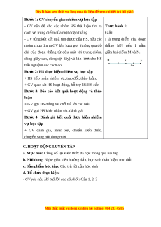 ậ tìm ra Thực hành 1: cách vẽ trung đi m ể c a m ủ t ộ đo n ạ th ng ẳ Gi i ả : - GV t ng ổ k t ế k t ế qu ả tìm đư c ợ c a ủ HS, n u ế các I là trung đi m ể c a ủ đo n ạ nhóm ch a ư tìm ra GV l n ầ lư t ợ g i ợ (thông qua độ th ng ẳ MN n u ế I n m ằ dài c a ủ đo n ạ th ng ẳ từ đ u ầ mút t i ớ trung đi m ể , gi a hai ữ đi m ể M và N. dùng gi y ấ can, dùng s i ợ dây) và l n ầ lư t ợ cho HS tr i ả nghi m ệ các cách đó Bư c ớ 2: HS th c hi ự n nhi ệ m ệ v h ụ c t ọ p ậ + HS ti p ế nh n nhi ậ m ệ v , t ụ rao đ i ổ , th o ả lu n. ậ + GV quan sát HS ho t ạ đ ng, ộ h t ỗ r khi ợ HS c n ầ Bư c ớ 3: Báo cáo k t ế quả ho t ạ đ ng ộ và th o ả luận + GV g i ọ HS đ ng ứ t i ạ ch t ỗ r l ả i ờ câu h i ỏ . + GV g i ọ HS khác nh n xét ậ , đánh giá. Bư c ớ 4: Đánh giá k t ế quả th c ự hi n ệ nhi m ệ vụ h c t ọ ập + GV đánh giá, nh n ậ xét, chu n ẩ ki n ế th c, ứ chuy n s ể ang n i ộ dung m i ớ C. HOẠT Đ N Ộ G LUY N Ệ T P Ậ a. Mục tiêu: C ng c ủ ố l i ạ ki n ế th c đã h ứ c t ọ hông qua bài t p ậ b. N i