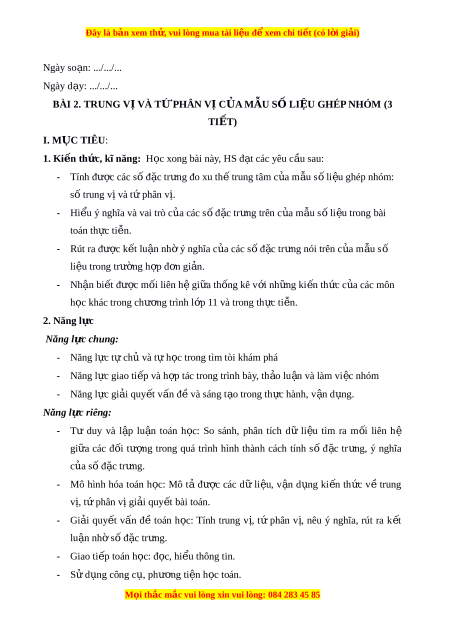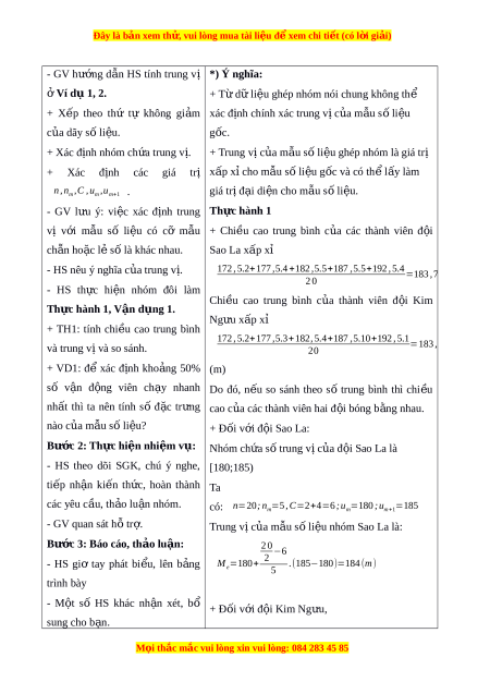 Đây là bản xem th , vu ử i lòng mua tài li u ệ đ xe ể m chi ti t ế (có l i ờ gi i ả ) - GV đ t ặ câu h i ỏ thêm: + Nh c ắ l i ạ cách xác đ n ị h s ố trung v ịc a ủ m u ẫ s ố li u ệ đã h c ọ ở l p ớ 10? (Khi ta s p ắ th ứ t ự các s ố li u ệ th n