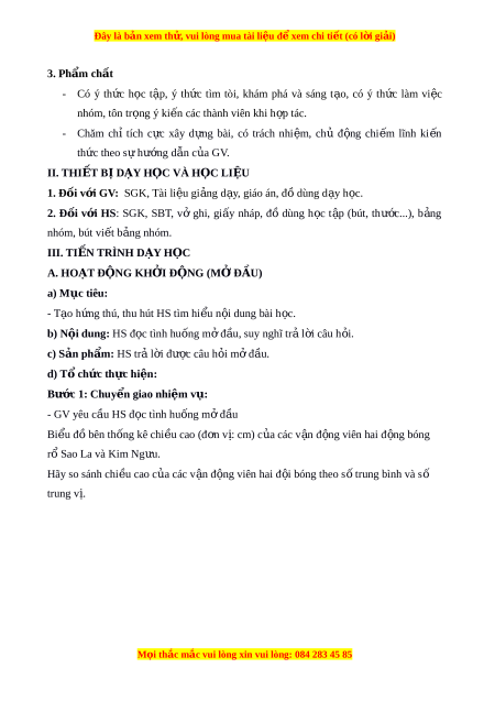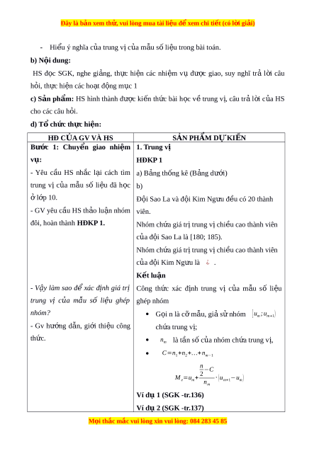 Đây là bản xem th , vu ử i lòng mua tài li u ệ đ xe ể m chi ti t ế (có l i ờ gi i ả ) - Hi u ể ý nghĩa c a ủ trung v ịc a ủ m u ẫ s ố li u ệ trong bài toán. b) N i ộ dung: HS đ c ọ SGK, nghe gi n ả g, th c ự hi n ệ các nhi m ệ vụ đ c ượ giao, suy nghĩ tr ả l i ờ câu h i ỏ , th c ự hi n ệ các ho t ạ đ n ộ g m c ụ 1 c) S n ả ph m