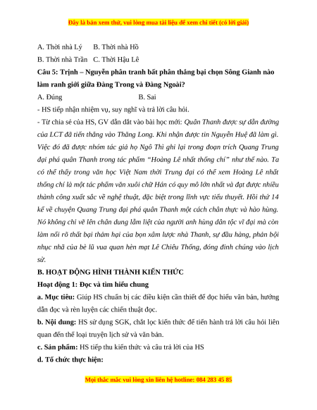 Câu 5: Trịnh – Nguyễn phân tranh bất phân thắng bại chọn Sông Gianh nào